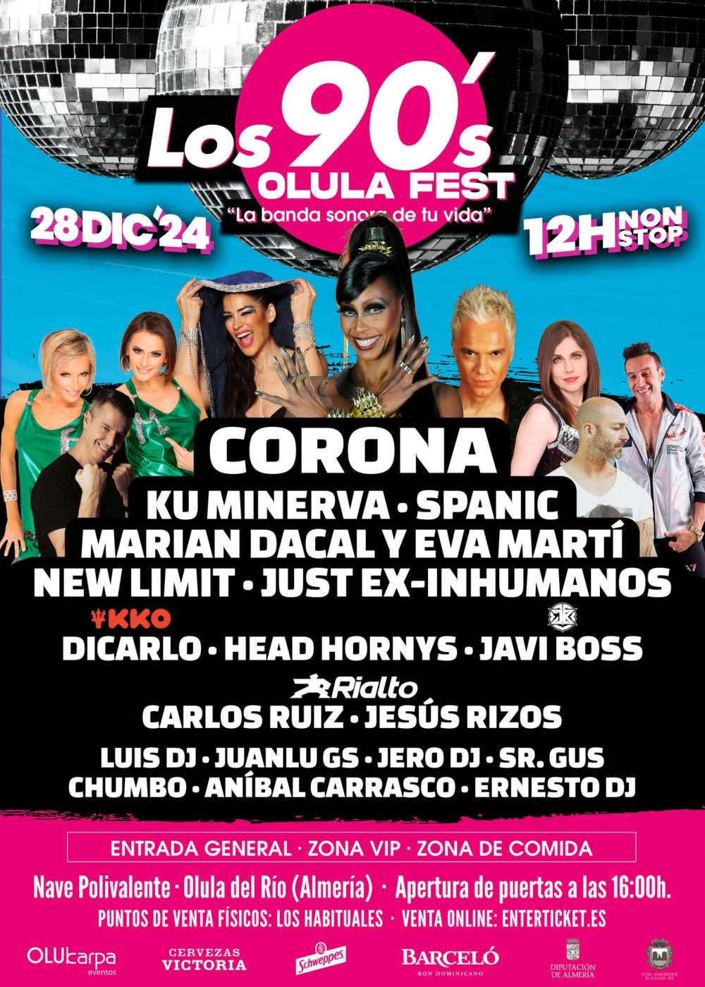 The 90’s Fest will make us dance again with: CORONA, KU MINERVA, SPANIC, MARIAN DACAL Y EVA MARTÍ, NEW LIMIT, JUST EX-INHUMANOS, DICARLO, HEAD HORNYS, JAVI BOSS, CARLOS RUIZ, JESÚS RIZOS, LUIS DJ, JUANLU GS, JERO DJ, SR. GUS, CHUMPO, ANÍBAL CARRASCO Y ERNESTO DJ.