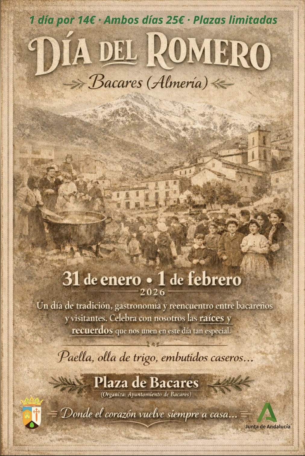 A day of tradition, gastronomy and reunion between Bacares residents and visitors. Celebrate with us the roots and memories that unite us on this special day.