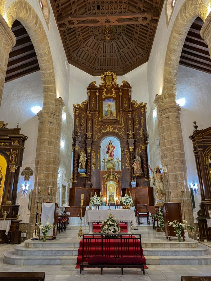 The Church of San Ginés, has three chapels of the eighteenth century, one dedicated to the Virgin of Carmen, another to the Dolores and another to the Rosario. Externally it is built of regular ashlars and has a square tower. The roof is a pair and knuckle armor, with double braces decorated with eight-pointed stars and alfardones, which is repeated in the guards of the two friezes and in the almizabe, which creates octagonal polygons to which are added pineapples.