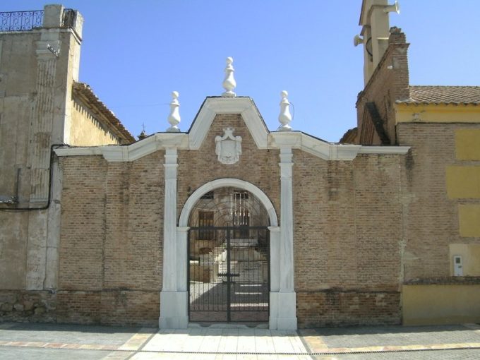 The external facade of the courtyard of honor is made of exposed brick, with white marble decoration, and in the center, a semicircular arch on pilasters framed by similar elements. A broken cornice lines its entire profile. In the center is the coat of arms of Abellán, which consists of a mantle that hangs the shield of Carlos III.