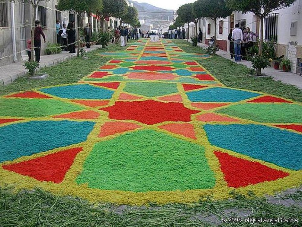 Un año más las calles del municipio de Tíjola serán las protagonistas de una de las decoraciones más singulares de la provincia, calles con dibujos realizados en serrín tintado que proporciona un colorido excepcional con lo que se homenajea a la Virgen de Fátima.