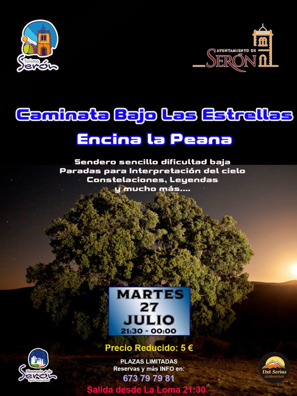 27 julio 2021. Encina de la Peana. Sendero sencillo de dificultad baja. Paradas para interpretación del cielo, constelaciones, leyendas y mucho mas. Caminata bajo las Estrellas.