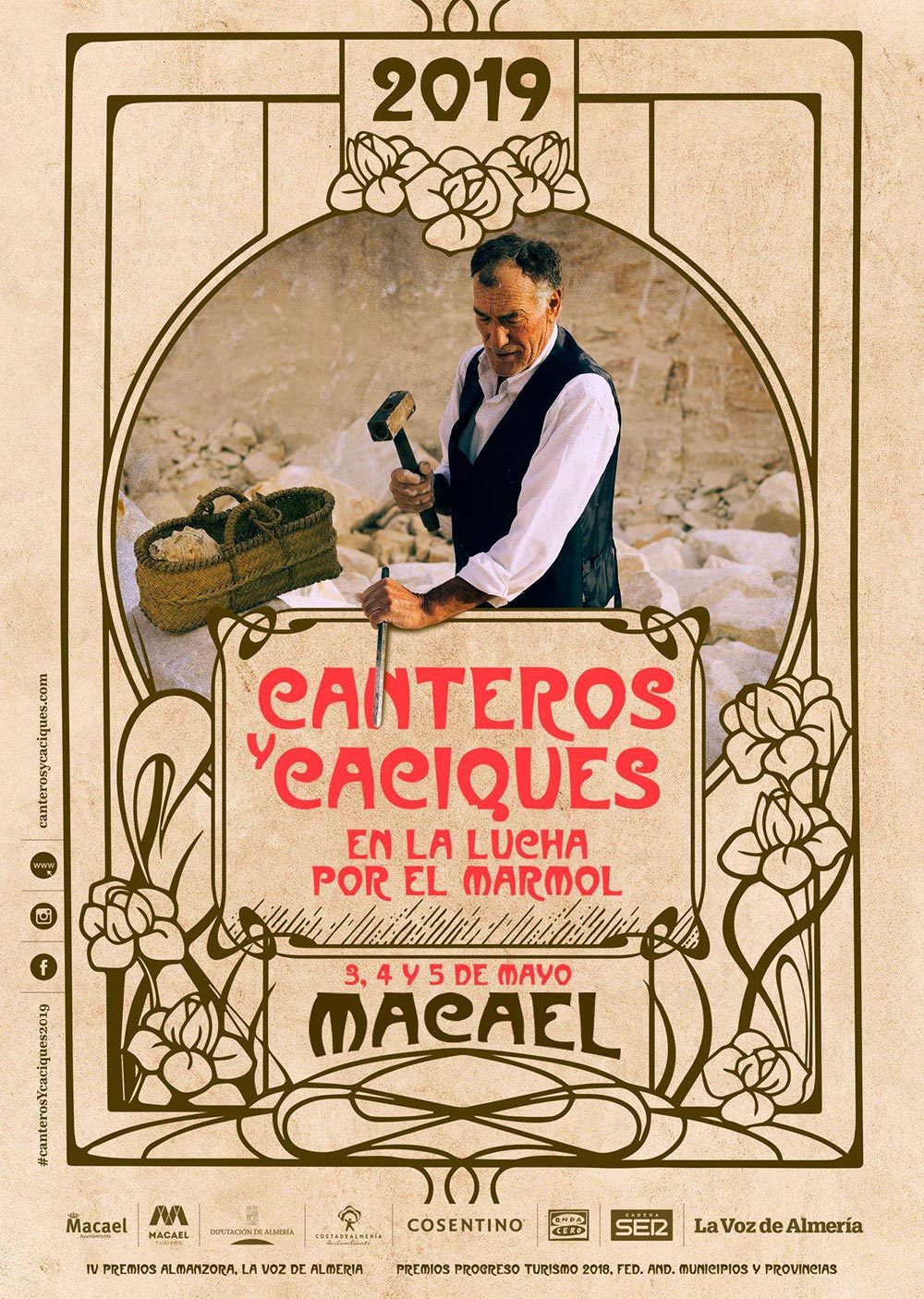 El 3, 4 y 5 de Mayo 2019, Macael se vestirá de época, volviendo al periodo comprendido entre 1919 y 1947. Nos encontraremos con canteros, arrieros, carreteros, dueños de canteras, fragüeros, chambilleros, amoladoras, lavanderas y otros personajes típicos de este tiempo dentro de un espacio lúdico caracterizado con los edificios y escenarios más representativos de ese periodo. En ellos la representación se mezclará con el público asistente, que tendrá la oportunidad de degustar tapas basadas en la gastronomía tradicional, bailar al compás de la música de la época (Charleston, pasodobles, Mazurca), contemplar demostraciones de labores de cantería, artesanía y escultura, cómo bajaban el mármol en carretas de bueyes, comprar productos típicos, escuchar cantes típicos de la época como las tarantas y los fandangos de Almería, y celebrar que el pueblo de Macael recupera sus canteras con barriles de vino, como ocurrió en 1947.