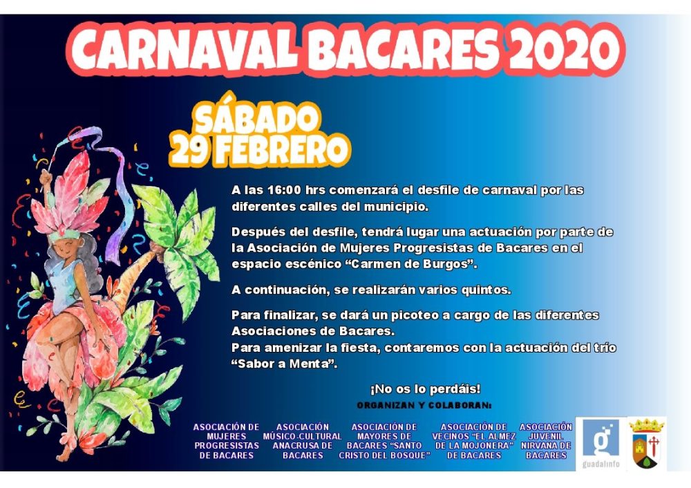 29 febrero 2020 en Bacares (Almería), desde las 16:00h desfile de carnaval por las calles del municipio.