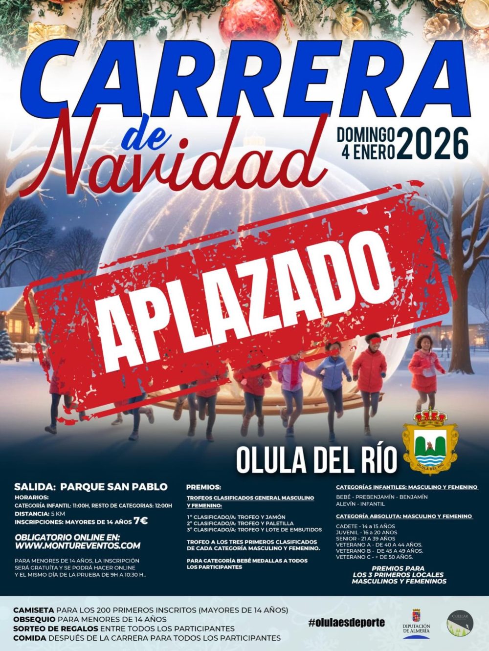 Debido a las condiciones meteorológicas, nos vemos obligados a aplazar la Carrera de Navidad, que estaba prevista para el 4 de enero, pasando a celebrarse el sábado 10 de enero.