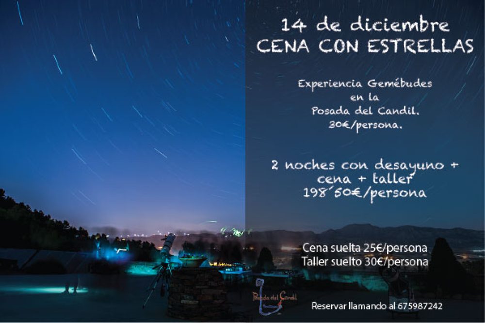 La Cena con Estrellas inaugurará la velada, donde comienzo a las 20.00h, y tras saborear el postre, dará comienzo el taller, que se compone de explicación y visionado del cielo estrellado.