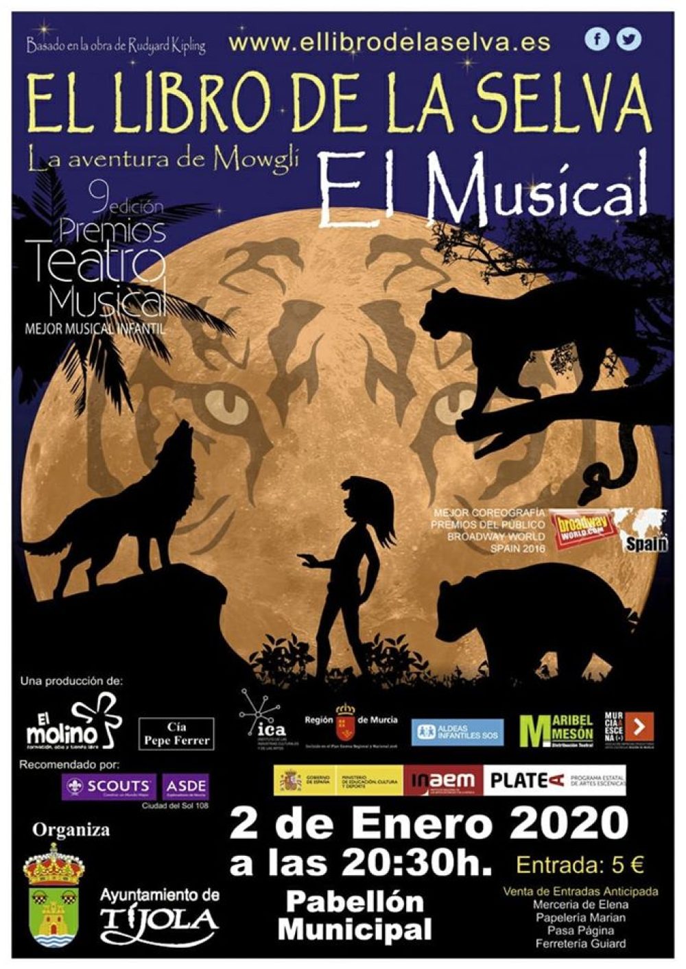 2 de Enero 2020 a las 20:30h, el Musical del Libro de la Selva llega a Tíjola. Precio de la entrada 5€. Venta anticipada en los siguientes establecimientos de Tíjola: Merecería Elena, Papelería Marian, Librería Pasa página y Ferretería Guiard.