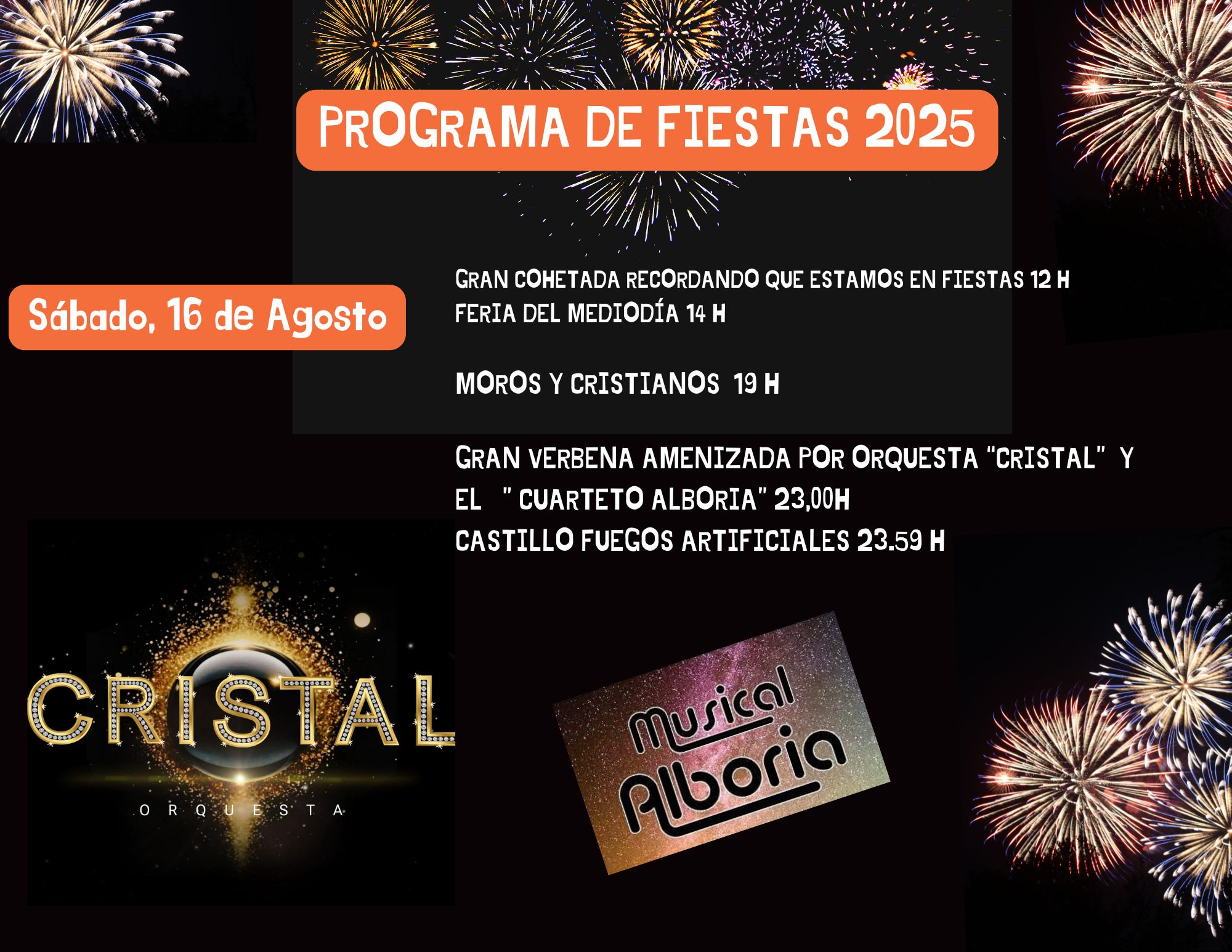 Feria del Mediodia, Verbena, Castillo de fuegos artificiales, Moros y cristianos, etc.