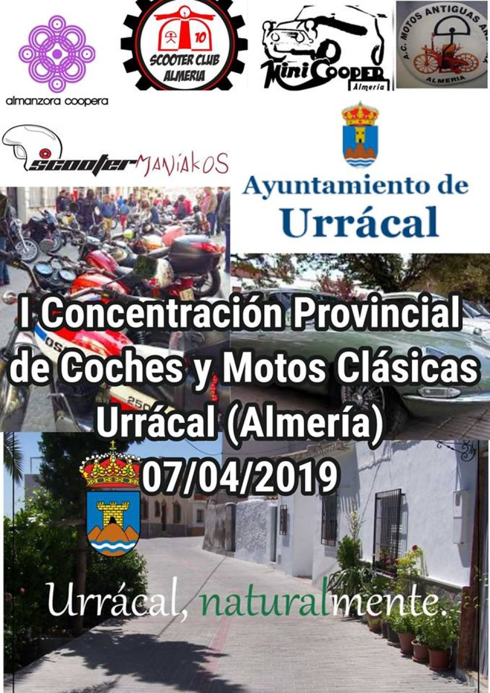 El próximo 07/04/19 los amantes de los vehículos clásicos (coches y motos) tienen una cita ineludible en Urrácal (Almería) La I Concentración Provincial de estos vehículos llega al Valle del Almanzora, convocados por el Excmo. Ayuntamiento de Urrácal y Almanzora Coopera. Colaboran la Scooter Club de Almería, A.C. Motos Antiguas Andarax, Mini Cooper Almería y Scooter Maniakos. La participación está limitada. Para cualquier información contactar con el Ayuntamiento. Gas!!!!
