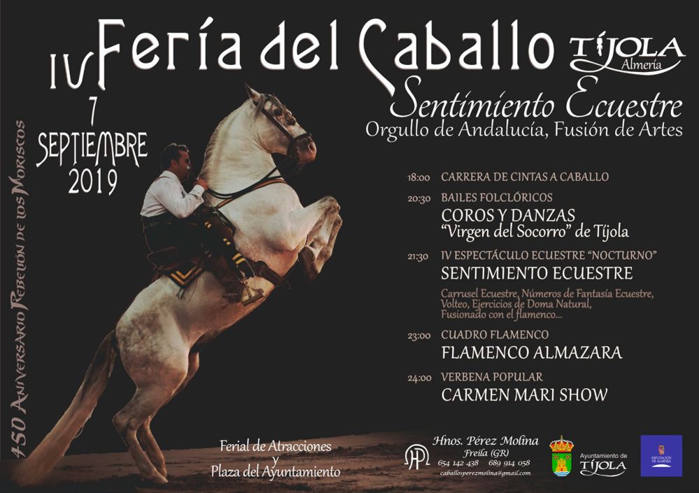 Sábado 7 septiembre 2019. Feria del Caballo de Tijola. Carrera de Cintas a Caballo. Bailes Folclóricos. Espectáculo Ecuestre nocturno. Cuadro Flamenco. Verbena Popular.