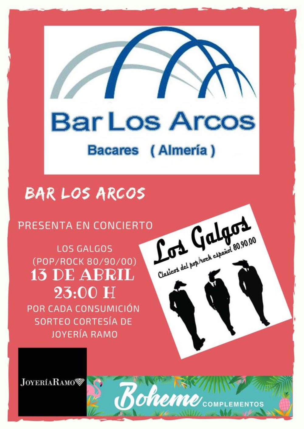 13 abril 2019 a las 23:00h Concierto de los Galgos (Clásicos del pop-rock español 80/90/00) en Bar los Arcos de Bacares.