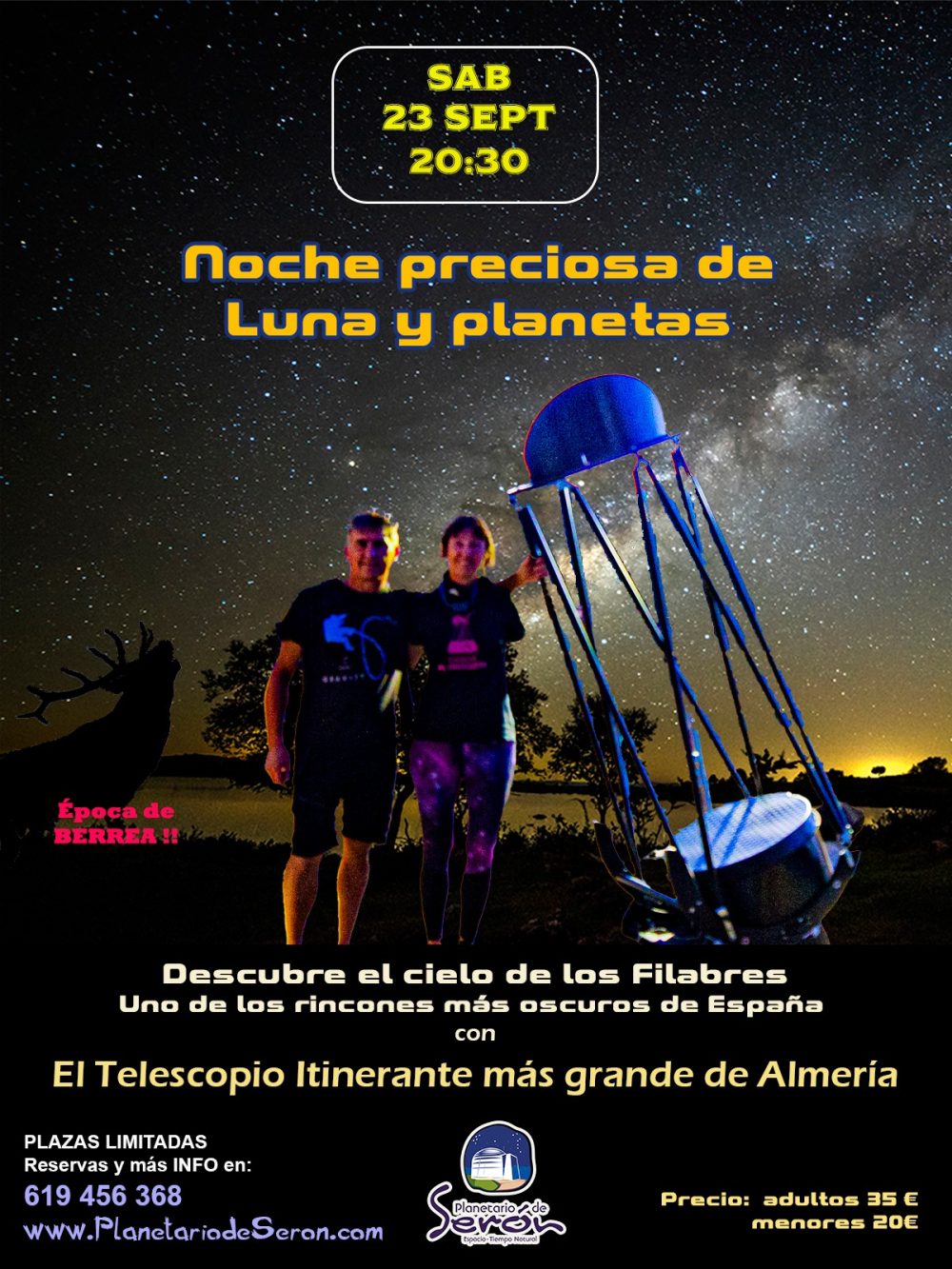 Noche Fantástica para disfrutar de los fabulosos cielos de la Sierra de los Filabres, y que con nuestro súper mega telescopio escudriñar el cielo con todos sus detalles. Noche hermosa de Luna, Nebulosas y por fin los Planetas Júpiter, Saturno, Urano y Neptuno. Sesiones didácticas, grupos REDUCIDOS. Llevamos nuestro telescopio gigante, el telescopio portátil más grande de Almería.