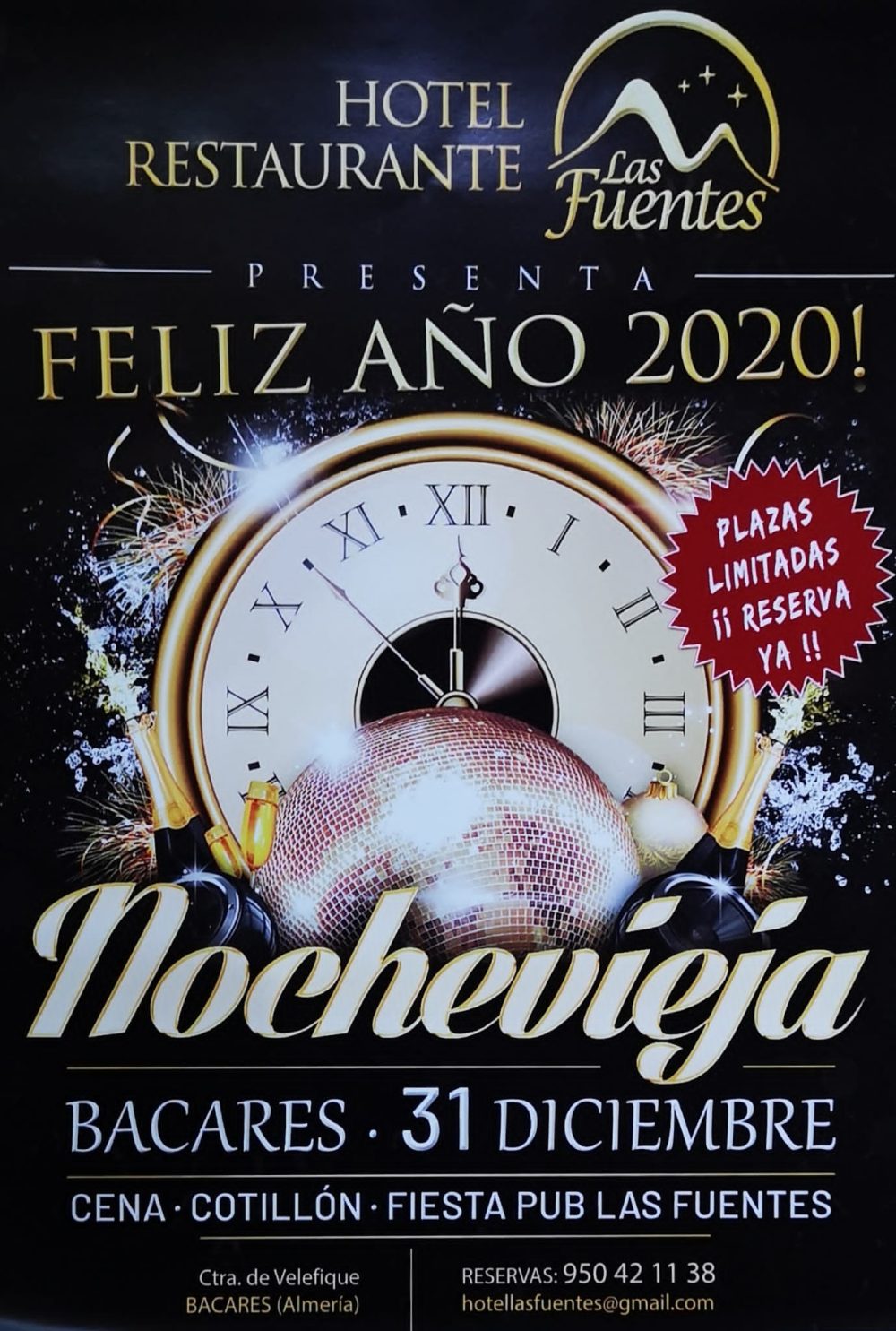 Da la bienvenida al 2020 con una fiesta de nochevieja en Hotel-Restaurante Las Fuentes – Bacares (Almería) con Cena, Cotillon y Fiesta Feliz 2020.