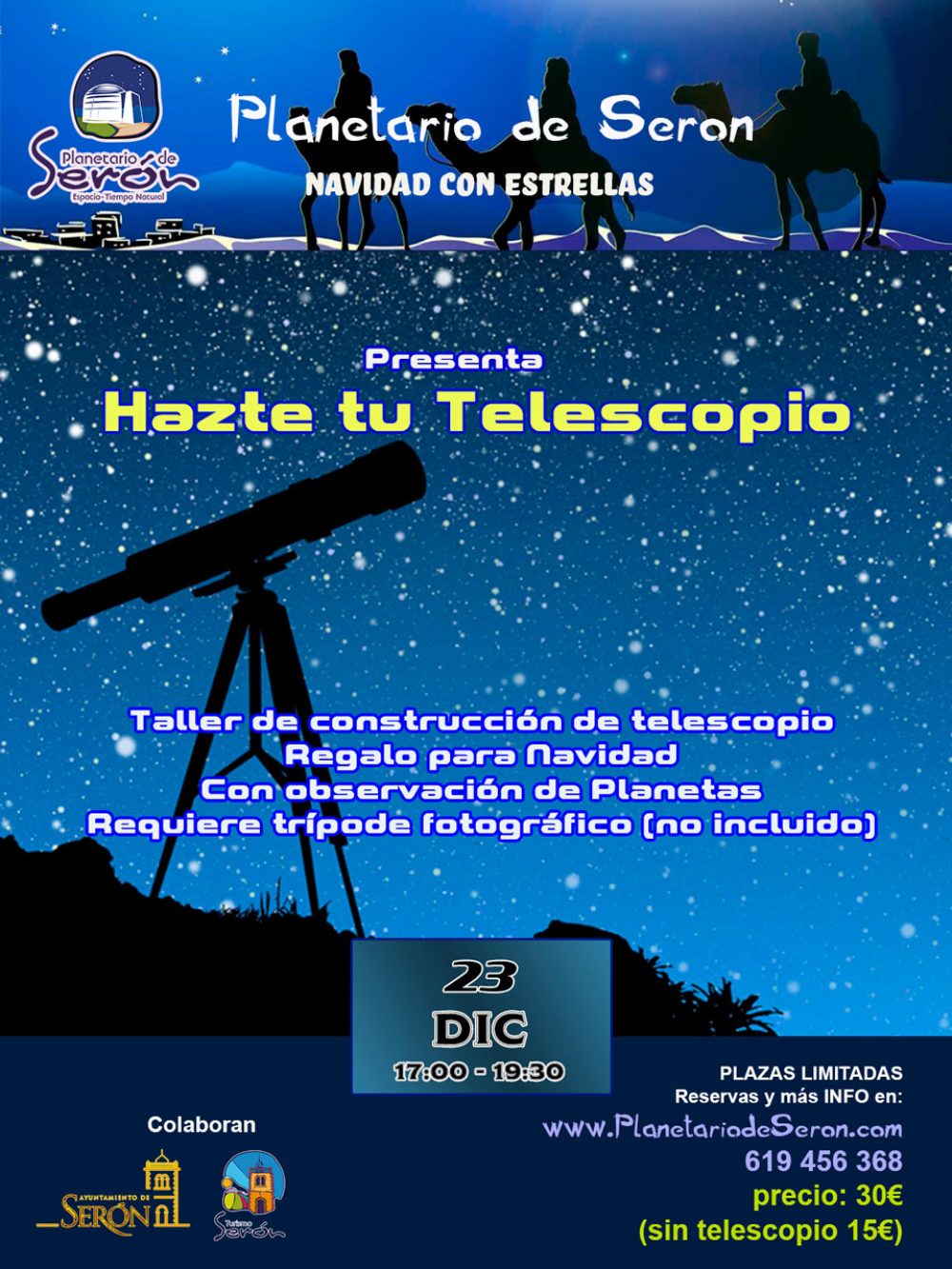 Taller de Construcción de tu telescopio. Ven y Constrúyete tu telescopio y llévatelo para Navidad. Además te enseñamos a manejarlo y disfrutar de los Planetas. El precio es de 30€ (Incluye el telescopio). Se requiere de un trípode fotográfico (NO incluído).