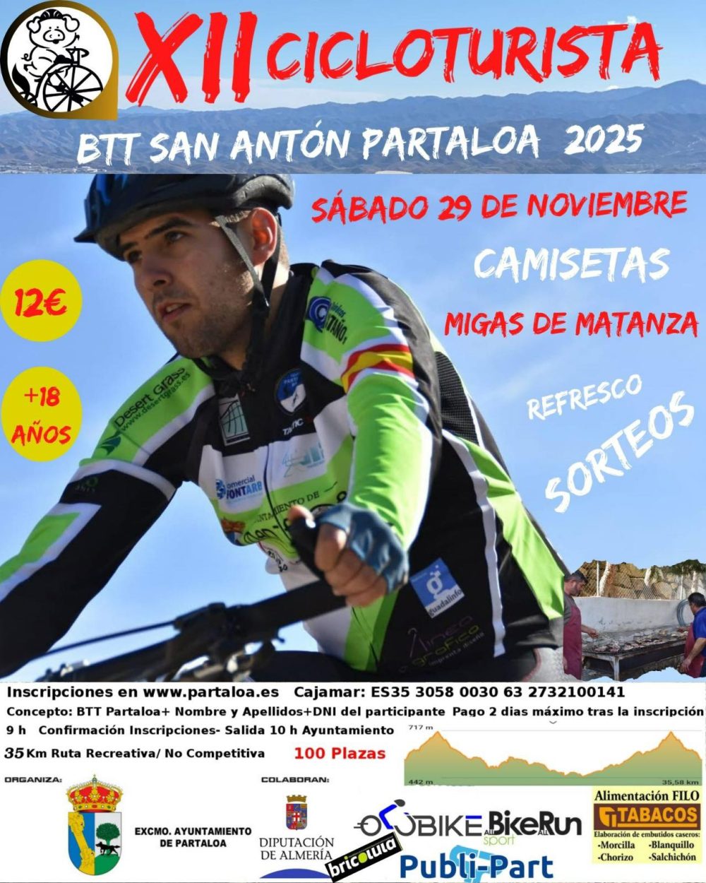 Sábado 29 de Noviembre , inscripciones en www.partaloa.es , 12€ en Cajamar: ES35 3058 0030 63 2732100141. Pago 2 días máximo tras la inscripción. Mayores de Edad. 35 Km