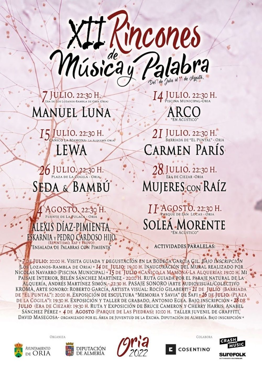Del 7 de julio al 11 de agosto de 2022 vuelve en ORIA (Almería) una nueva edición de Rincones de Musica y Palabra.