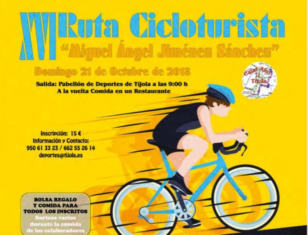 El próximo 14 de octubre con salida a las 09:00h en el Pabellón municipal de Tíjola tendrá lugar la XVI Ruta Cicloturista «Miguel Ángel Jiménez Sánchez».