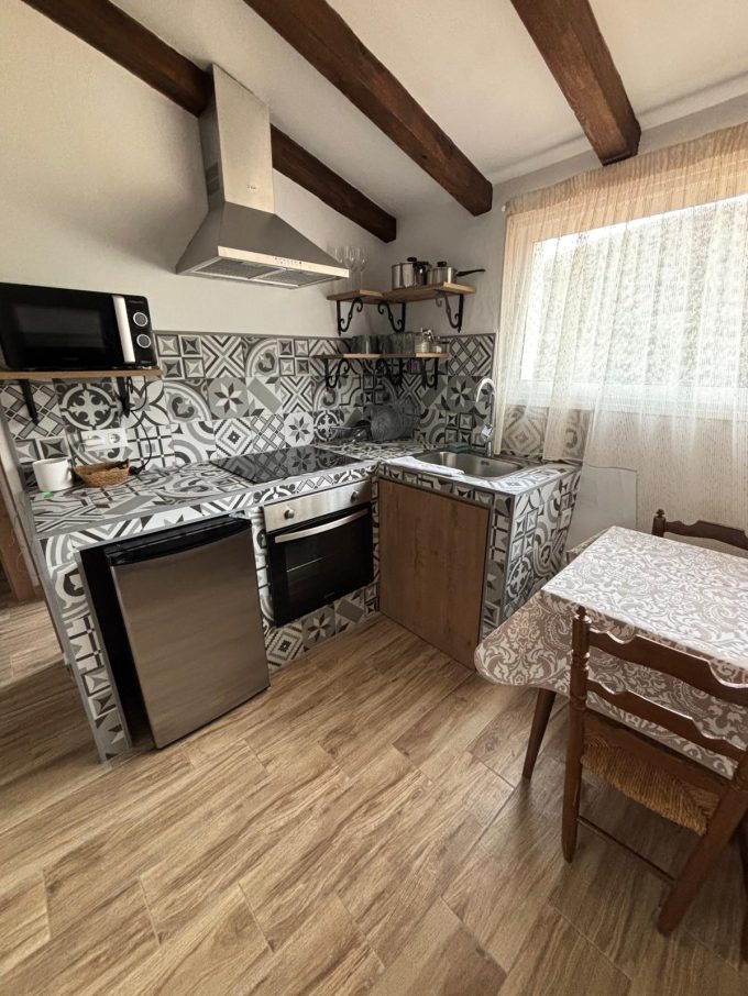 • Cocina en forma de L equipada con menaje y electrodomésticos.
