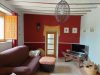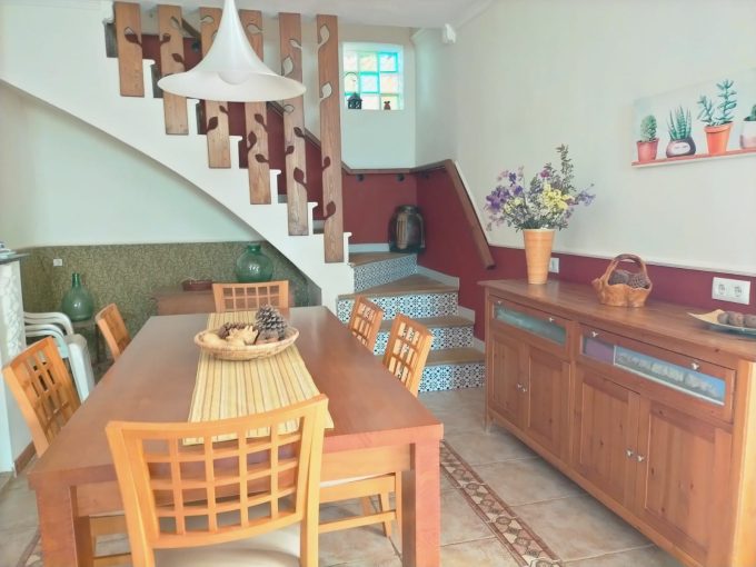 En la planta baja tiene una gran cocina con mesa para hasta 12 comensales, con dos hornos, un microondas, lavavajillas, etc. ; un bonito baño con ducha, decorado con piedra «travertino amarillo» de la zona, una habitación de juego para los niños con un pequeño sofá cama; y un cómodo salón frente a la chimenea que tiene salida hacia el jardín. La casa no tiene televisión porque preferimos disfrutar de la paz y la tranquilidad de la zona.