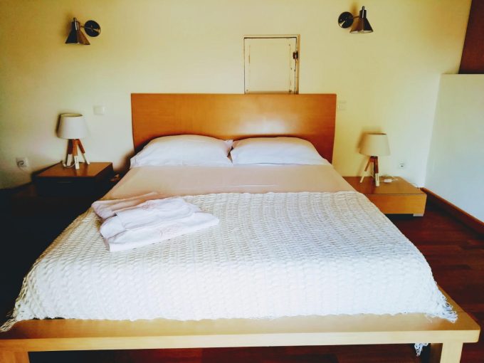 En la planta alta hay un espacioso cuarto de baño con ducha y una relajante bañera triangular; una habitación con una cama grande y otra pequeña; y la inmensa habitación principal con una cama grande y otra pequeña, un gran guardarropas, un sillón de lectura, y la ventana que da al jardín y por donde se disfruta del espectáculo de la salida del sol desde la cama.