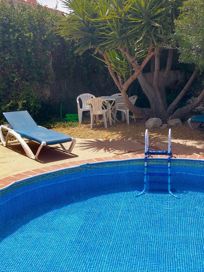 Tiene un jardín con un porche y con árboles de hoja caduca que dan una buena sombra en verano, y dejan pasar el sol en invierno. En el jardín hay una piscina redonda de 4,6 metros de diámetro.