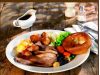 Jugosas y con todo el sabor, nuestras carnes se cocinan con aceite de ajo y perejil, a la plancha o a la brasa. Incluyen patatas caseras, puré o ensalada.