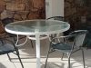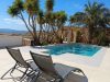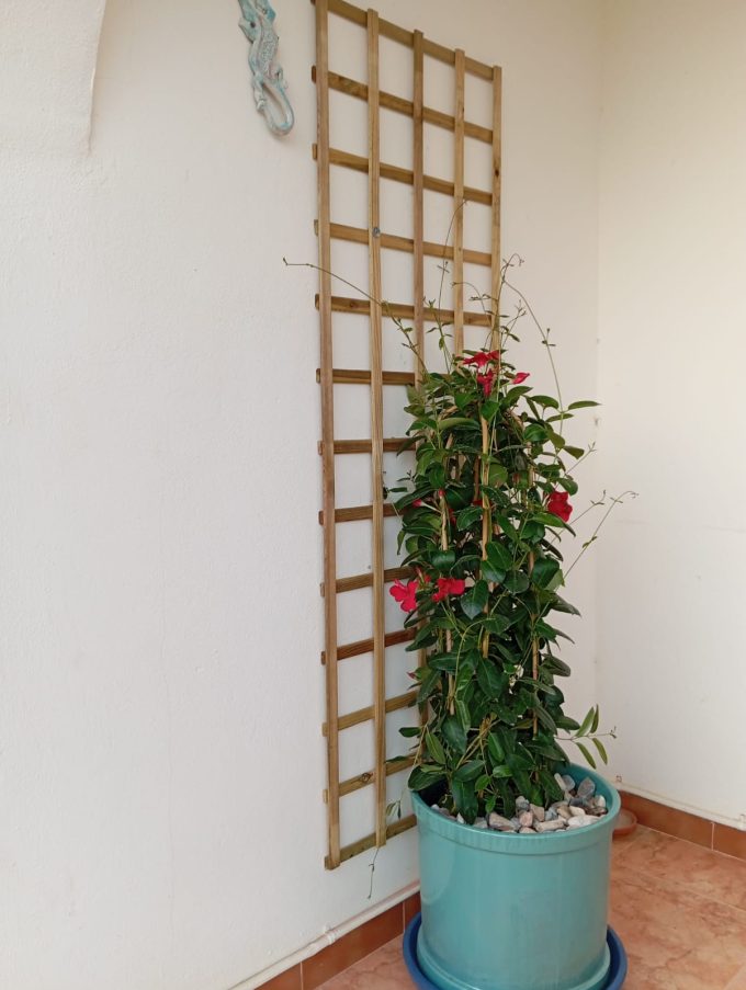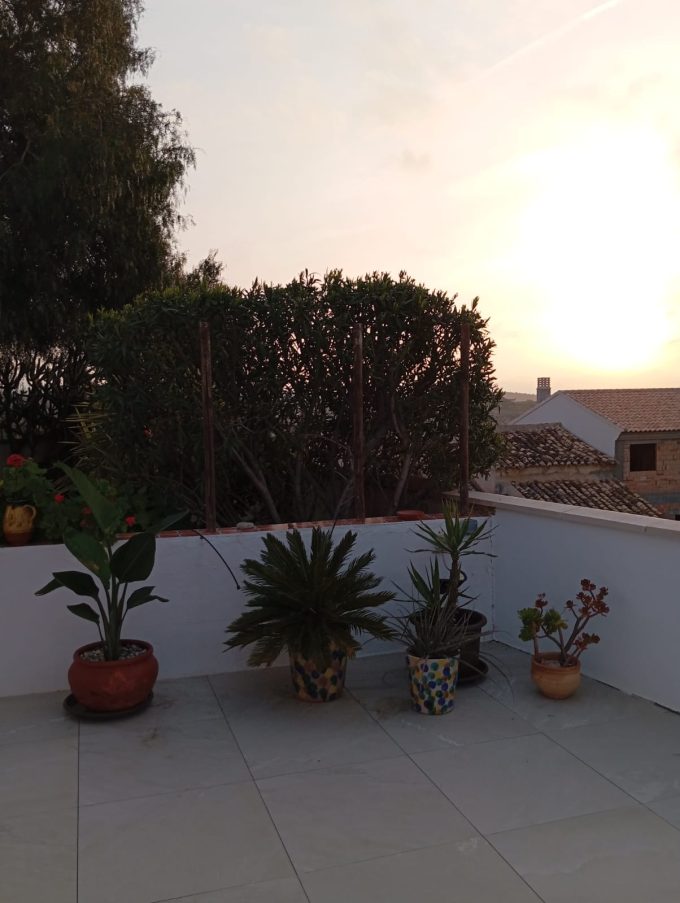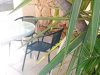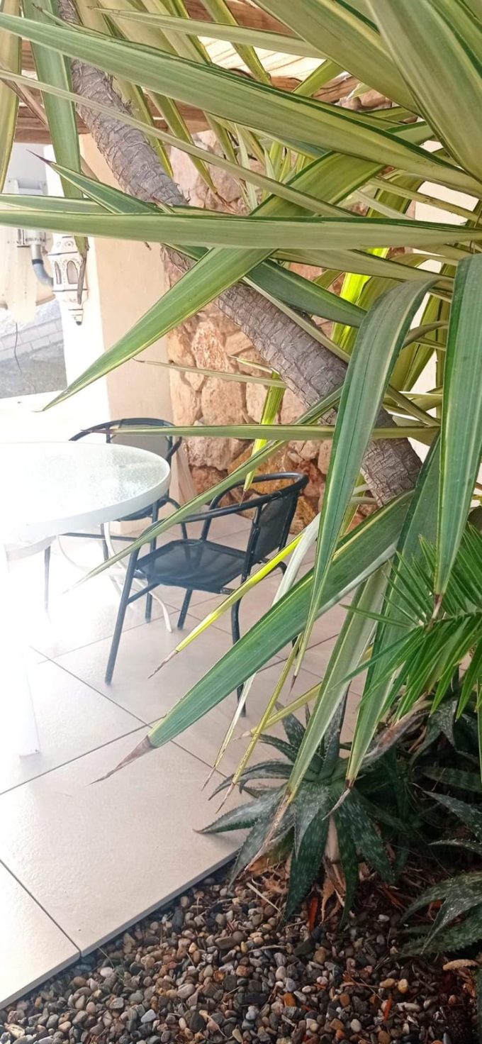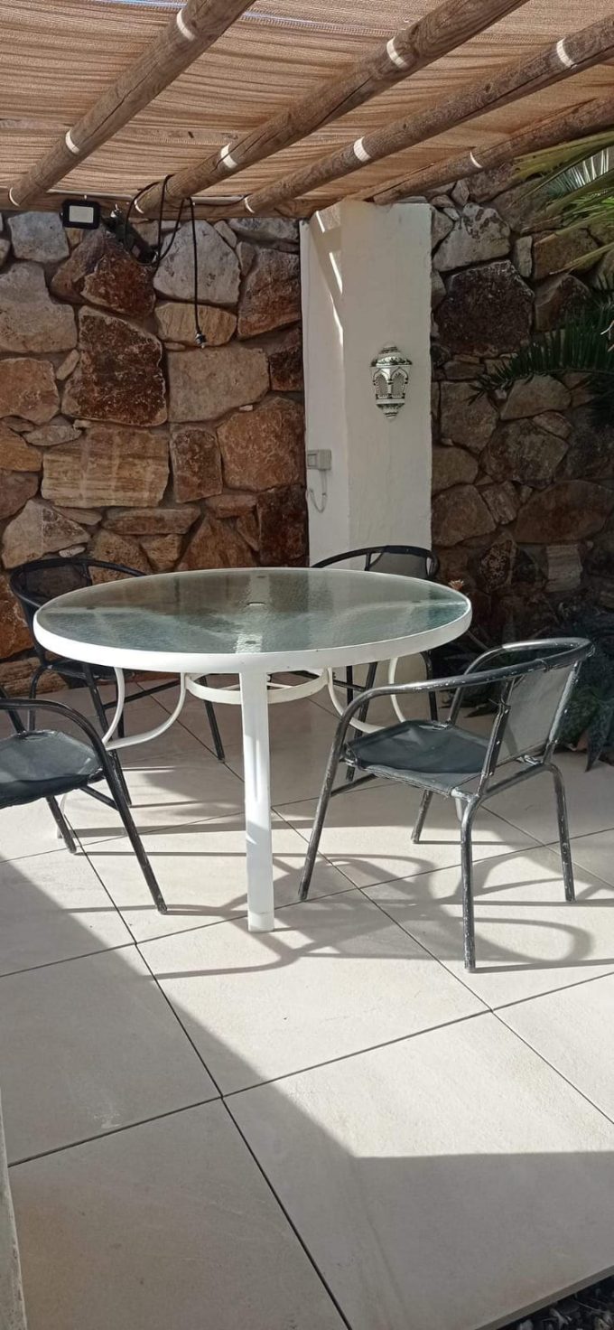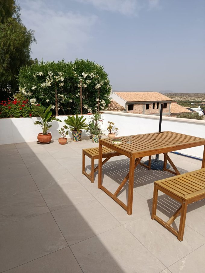 Hay una gran terraza junto a la piscina y una pequeña para comer a la sombra cerca de la cocina.