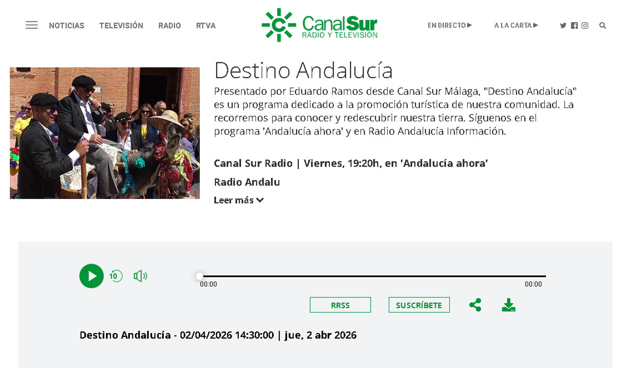 Presentado por Eduardo Ramos desde Canal Sur Málaga, «Destino Andalucía» es una sección del programa ‘La tarde de Canal Sur Radio con Mariló Maldonado’ dedicada a la promoción turística de nuestra comunidad. Cada semana recorren Andalucía para conocer y redescubrir nuestra tierra.
