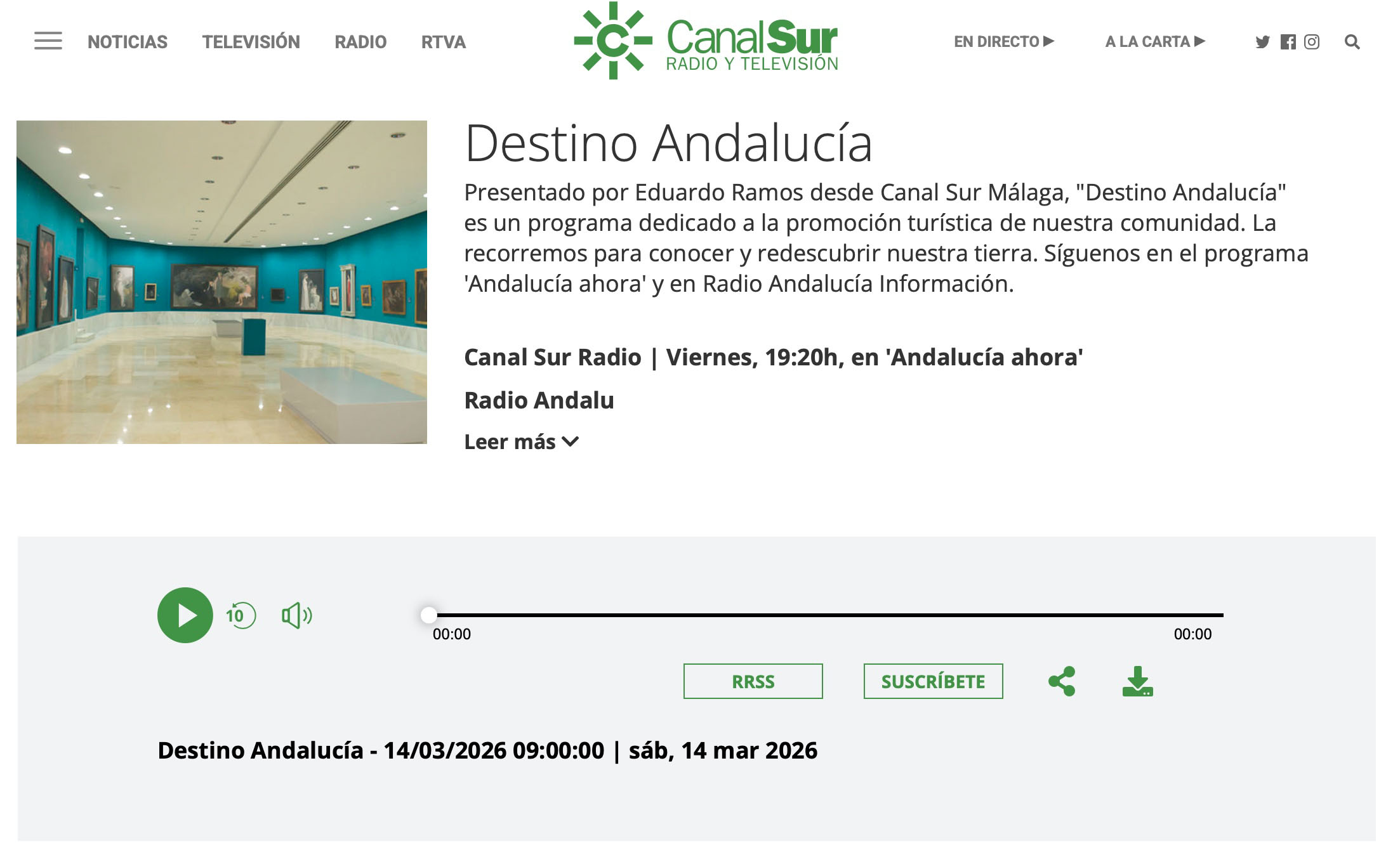 Presentado por Eduardo Ramos desde Canal Sur Málaga, «Destino Andalucía» es una sección del programa ‘La tarde de Canal Sur Radio con Mariló Maldonado’ dedicada a la promoción turística de nuestra comunidad. Cada semana recorren Andalucía para conocer y redescubrir nuestra tierra.
